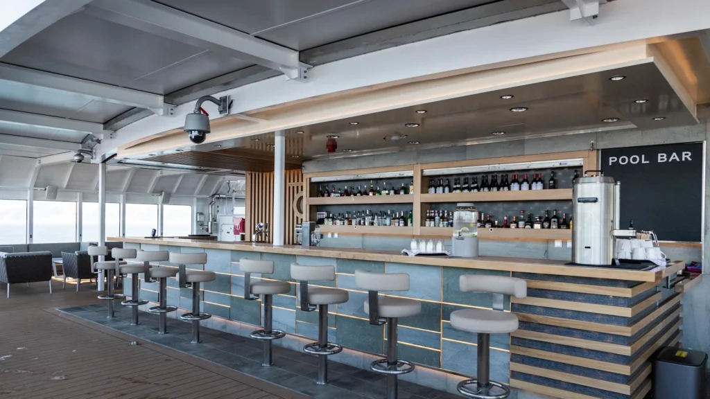 Ekspedisjon Suite, øvre dekk med balkong :22–28 m², privat balkong, dobbel-/twin‑seng og sofabed, minibar, TV, kaffemaskin, badekåper