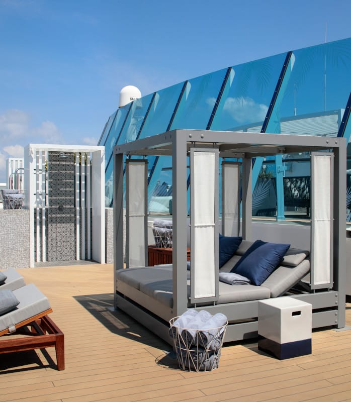 Pool deck & solarium, med basseng, boblebad og varme omgivelser – også voksen­avdeling . Retreat Sundeck: eksklusivt soldekk for suite-gjester med komfortable solsenger og loungemøbler. iLounge: moderne workspace for arbeid, kurs og avslapning. Fullt utstyrt treningssenter med moderne utstyr.