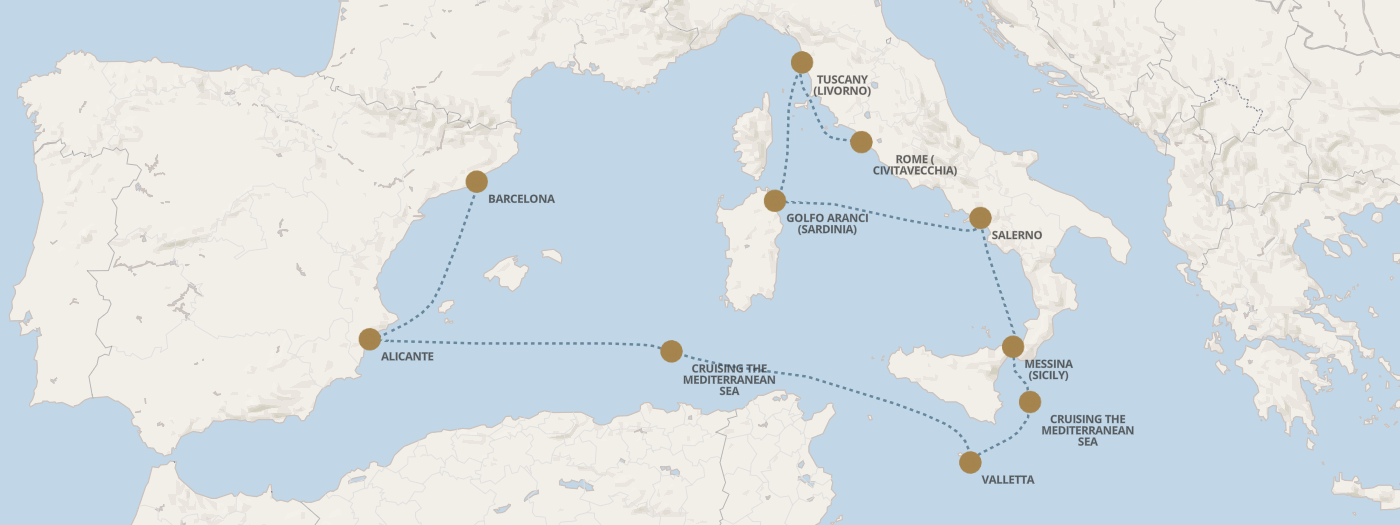 Etter denne storslåtte opplevelsen fortsetter reisen til Catania på Sicilia, der du får møte ekte sør-italiensk atmosfære i skyggen av Etna. Så til Salerno, inngangsporten til Amalfikystens dramatiske klipper og pastellfargede landsbyer. På Sardinia går du i land ved Golfo Aranci, omgitt av turkist vann og stille natur, før cruiset nærmer seg slutten i Livorno, porten til Toscanas kunst, vin og landsbyliv. Til sist ankommer du historiske Roma (Civitavecchia) – en storslått avslutning i den evige stad.