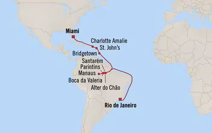 Bli med på et uforglemmelig 21-dagers cruise med Oceania Cruises, hvor reisen starter i fargerike Rio de Janeiro, går inn i den mytiske Amazonas-elven, og avsluttes i pulserende Miami. Underveis får du oppleve en imponerende miks av natur, kultur og tropisk livsstil.