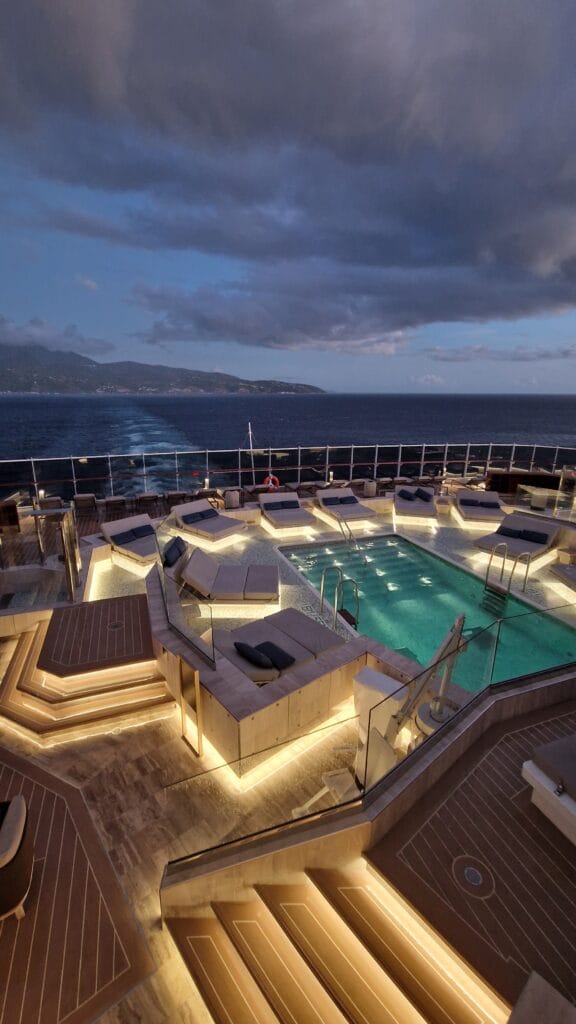 Skipets wellness-senter byr på signaturbehandlinger, meditasjonsritualer og spesialprogrammer for søvn, immunforsvar og mindfulness . De rustikke spa-fasilitetene med saltgrotte, steam, sauna, isfall og varme loungers gir en helhetlig oase .