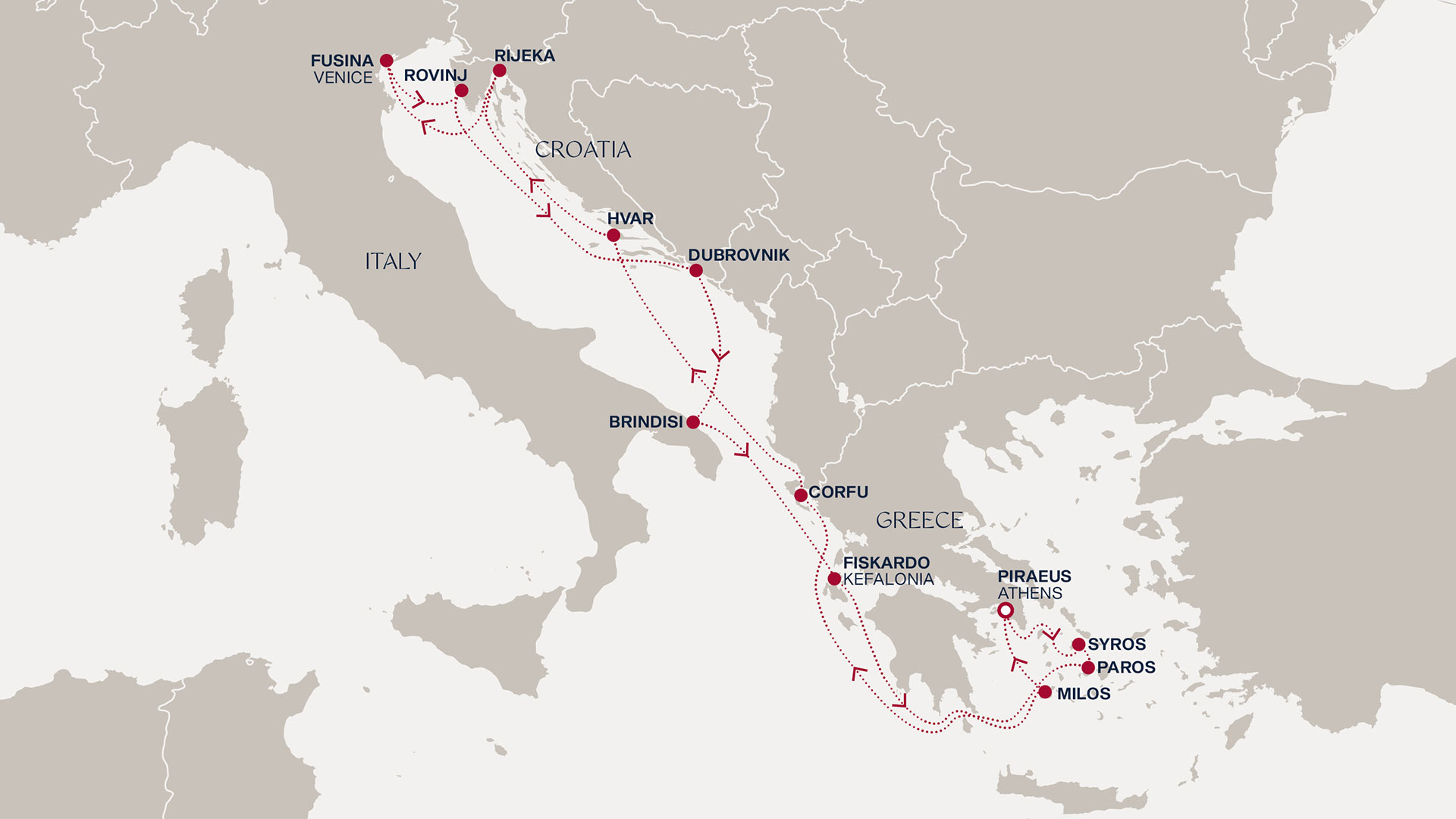 I Sør-Italia venter Brindisi, en havneby full av historie og sjarm, før du igjen krysser over til Hellas og oppdager den idylliske havnen i Fiskardo (Kefalonia) – en rolig, luksuriøs øy med turkist vann og tradisjonell gresk arkitektur. Etter en dag til sjøs avsluttes reisen med et magisk besøk til Milos, øya med de vakre klippene, varme kildene og de skjulte strendene – før du returnerer til Pireus/Athen med minner for livet.