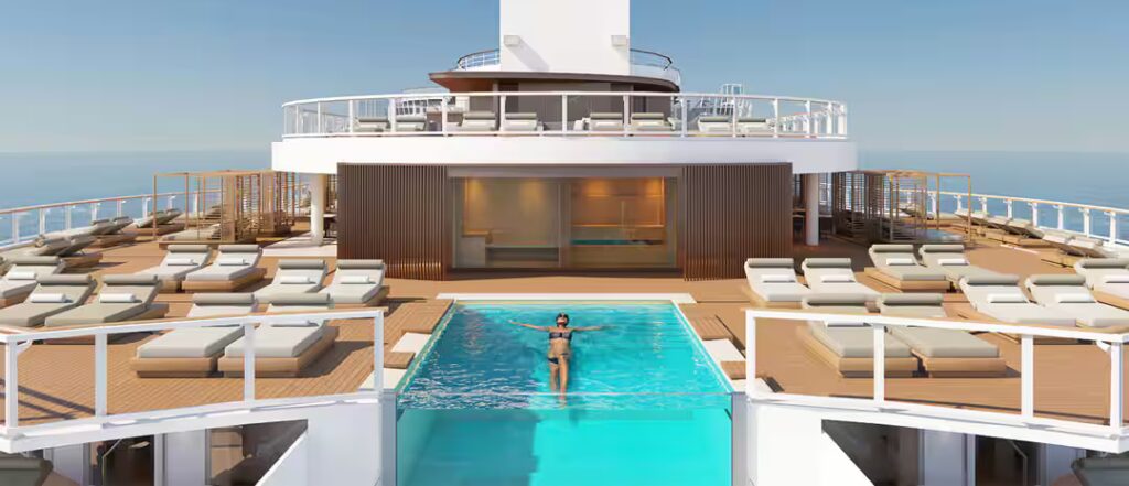 Aqua Slidecoaster: Adrenalinfylt dual-slide med magnetheis over tre dekk rundt skorsteinen. The Drop: Ti-etasjers fritt fall-sklie. Infinity Beach: Infinity‑bassenger og soldekk langs Ocean Boulevard. Familiesone: Kids’ Aqua Park, splash pad, VR, interaktive dart‑ og minigolf‑baner.