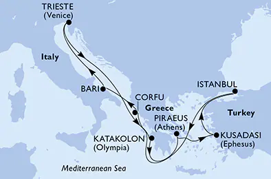 Carica er cruiseeksperter som hjelper deg med å finne det beste cruiset tilpasset ditt reisebudsjett. De har full oversikt over alle seilinger med MSC Fantasia, samt pågående kampanjer – slik at du enkelt kan realisere din neste cruiseferie til en god pris. Du kan starte dette cruiset i Trieste, Bari, Athen og Istanbul.