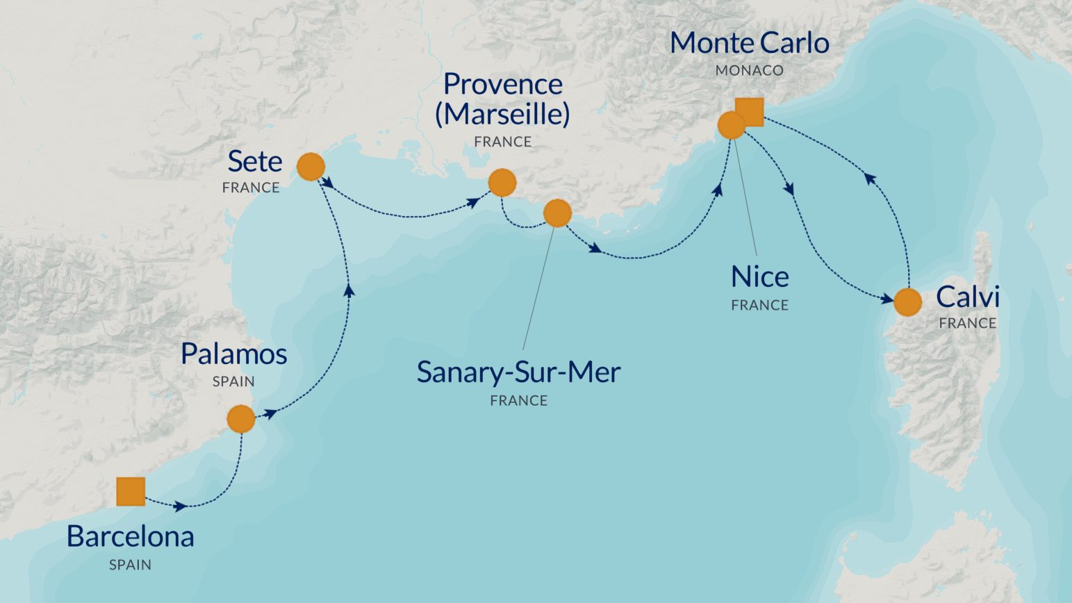 Neste stopp er vakre Sanary‑sur‑Mer, en mindre og mer eksklusiv havneby hvor den franske riviera virkelig viser seg fra sin beste side. Deretter anløper du ikoniske Nice, med sin berømte promenade, pastellfargede bygninger og livlige atmosfære. På Calvi på Korsika får du dramatisk natur og strandliv i skjønn forening, før cruiset avsluttes i glamorøse Monte Carlo, hvor Middelhavets luksus møter rivieraens eleganse.