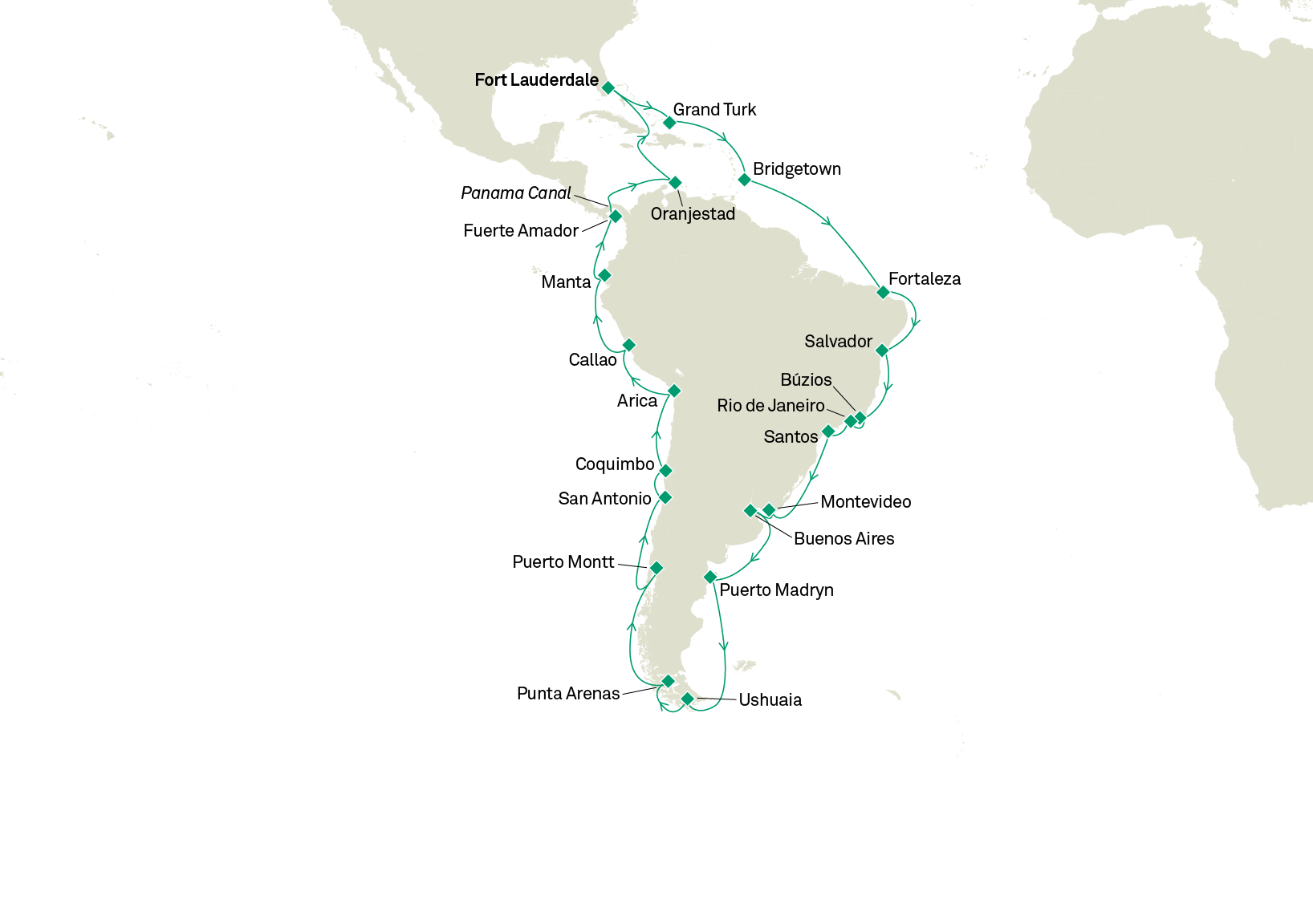 Underveis opplever du noen av verdens mest ikoniske høydepunkter: solfylte karibiske øyer, det fargesprakende karnevalet i Rio, den legendariske rundingen av Kapp Horn, mektige isbreer og den imponerende seilasen gjennom Panamakanalen. Hver dag byr på nye kontraster – fra pulserende storbyer til uberørt natur.