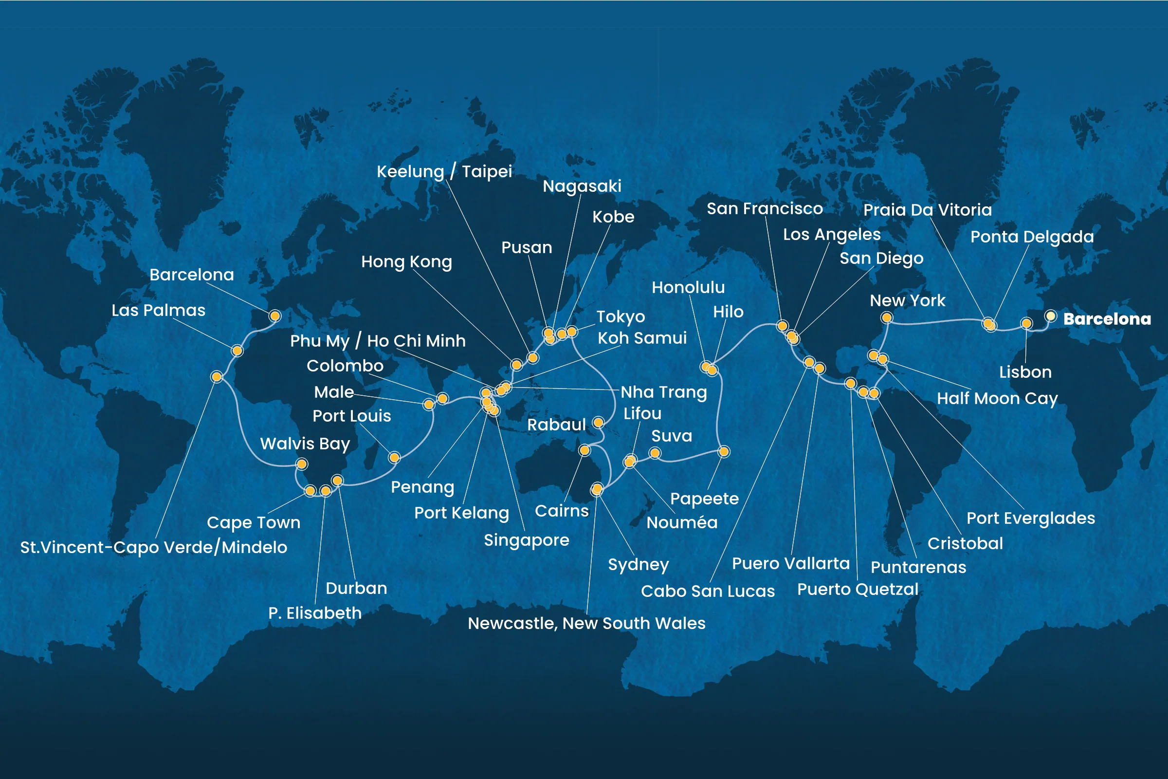 Verdenscruise med Costa Deliziosa er den ultimate reise for deg som vil se verden fra sitt mest spektakulære perspektiv – fra komforten om bord på et italiensk cruise skip fylt med eleganse, underholdning og luksus. Costa Deliziosa tilbyr en helt unik jordomseiling som strekker seg over 130–140+ dager, og tar deg rundt halve eller hele kloden med besøk i flere kontinenter og spennende land. Seilingen går typisk fra Europa via Karibien og Sør-Amerika, videre over Stillehavet til paradisøyer i Fransk Polynesia og Fiji, og innom store byer slik som Sydney i Australia. Reisen fortsetter gjennom Asia med stopp i Japan, Sør-Korea, Vietnam, Singapore og mer, før den går gjennom Det indiske hav med destinasjoner i Sri Lanka og Mauritius og til slutt tilbake mot Europa.