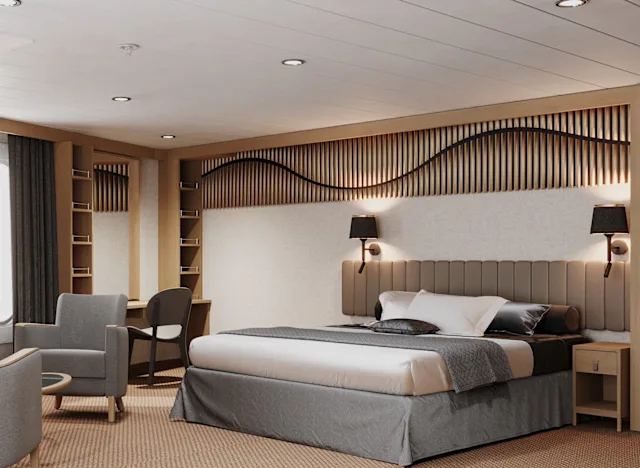 Grand Suite : Suite på øvre dekk med balkong, sittegruppe, dobbeltseng og stort vindu. Badekåper og tøfler er tilgjengelig på forespørsel.