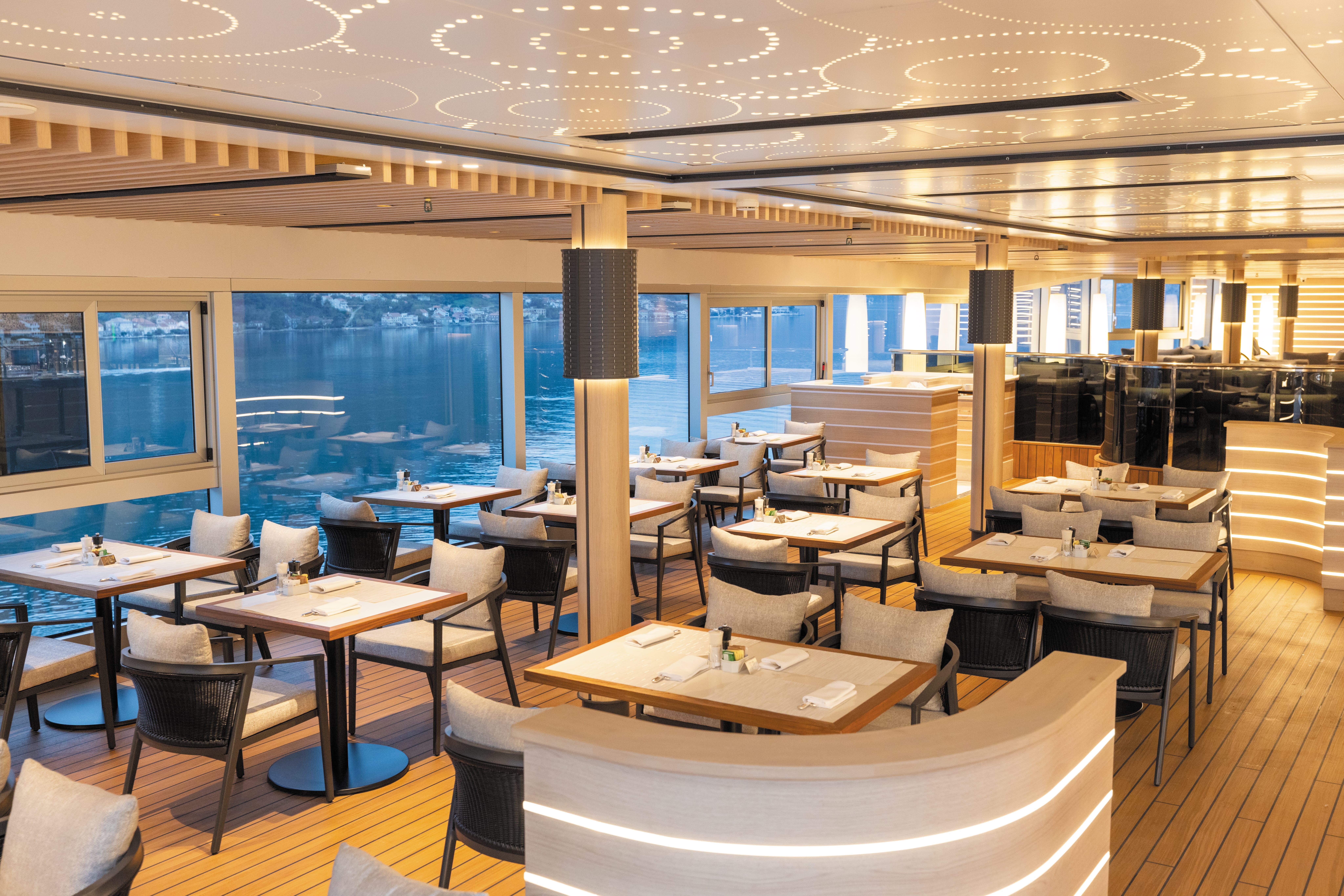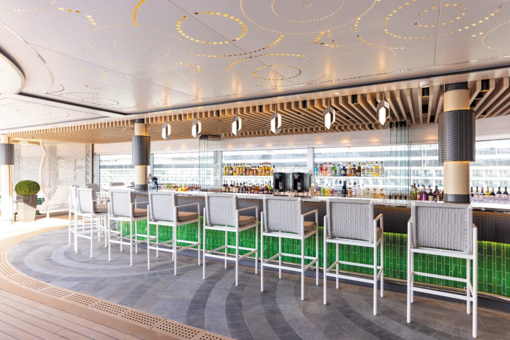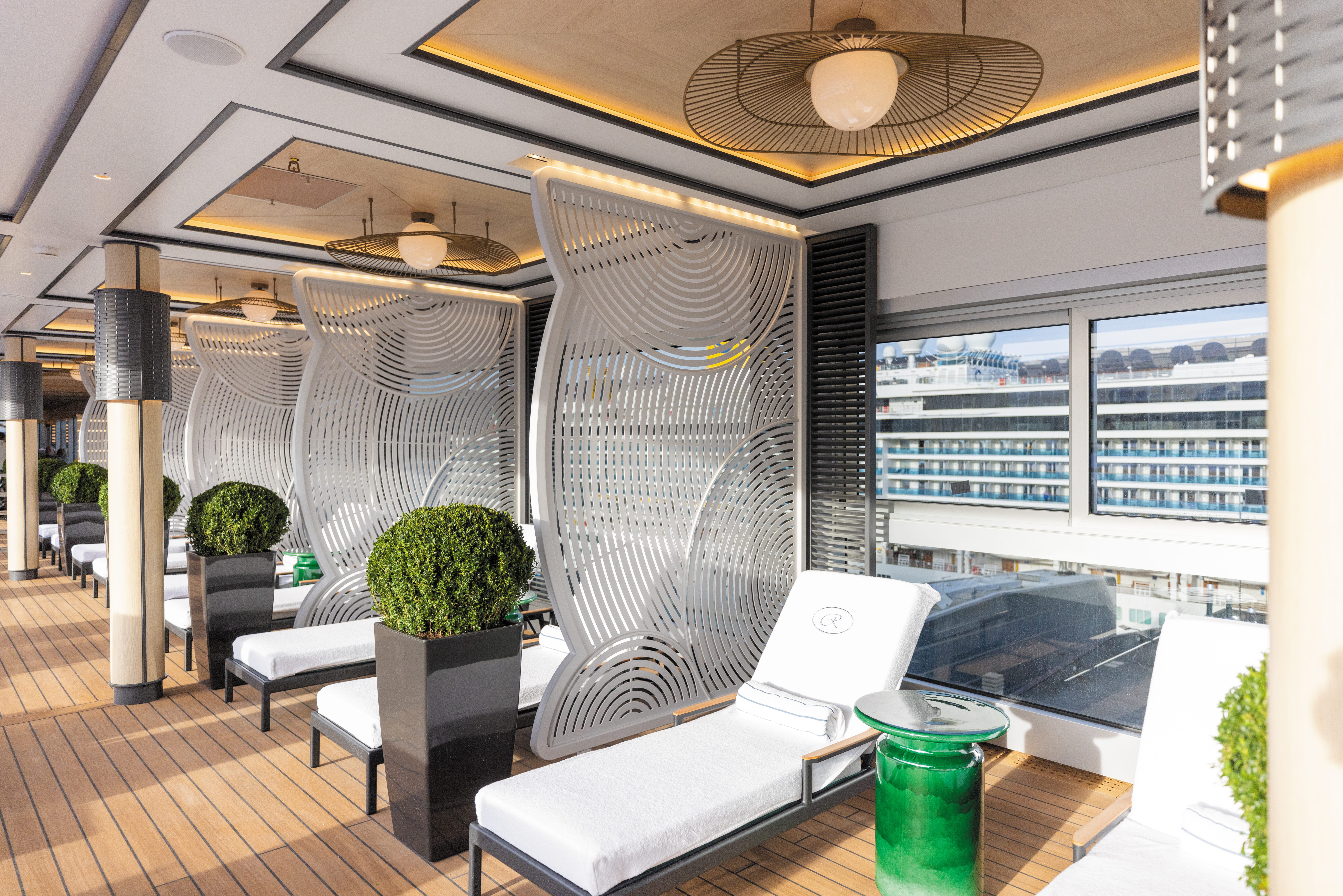 Wellness-fasiliteter: Spa med sauna, kaldrom, pillar-skyller og utendørs varmt-kaldt område med tre boblebad . Sportsdekk (dekk 12): løpebane, golfnett, boccia, shuffleboard og pickleball . Culinary Arts Kitchen: interaktive matlagingskurs i profesjonelt kjøkken Wine tastings, shuffleboard-turneringer, og kunstomvisninger via mobilapp .